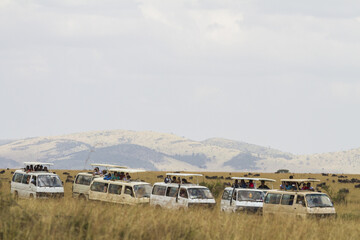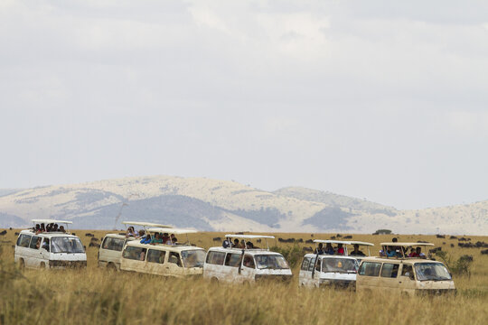 Narok, Kenya - 08 September 2015: View of safari vehicles traversing the golden grasslands of the Maasai Mara, with tourists observing wildlife against a backdrop of distant hills.