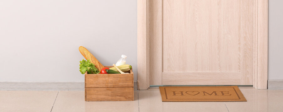 Products left by courier of food delivery service near door. Concept of epidemic