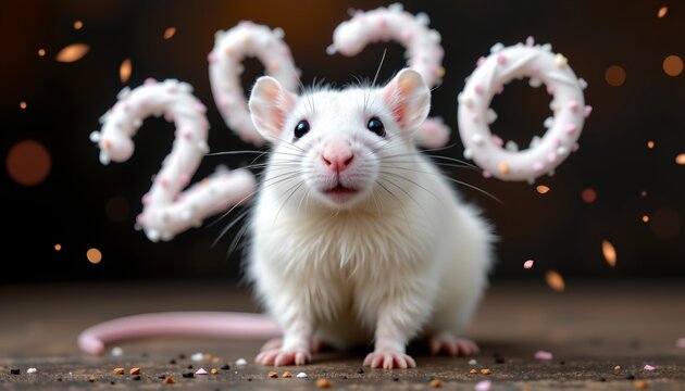 a petite white rat adorned with 2020 themed party gear, including oversized pink ears, a birthday cake hat, and party horns, standing on a surface scattered with confetti