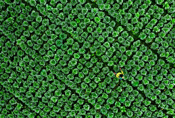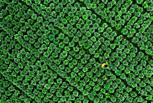 Bogura, Bangladesh - 14 November 2021: Aerial view of a vibrant, verdant cabbage field, where a lone figure in yellow tends to the rows of tightly packed, leafy greens.