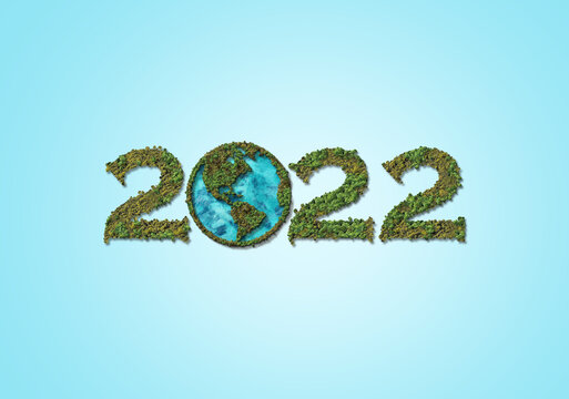 Happy New Year 2022 Concept. 3D Forest or tree shape isolated on 2022  lettering typography. World Environment and Earth Day Concept.