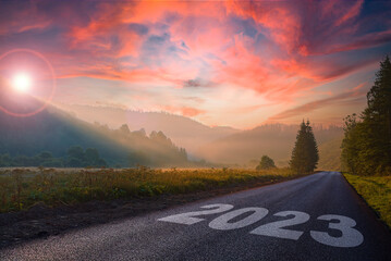 road on which is written 2023 at sunrise in the mountains .beginning of 2023 morning fog near the forest and mountains and the road. beautiful sky. concept of the road to ecology.