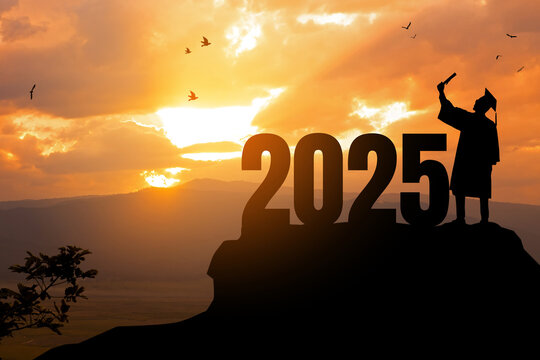 2025 New Year resolution.Silhouette Young man Graduation in 2025 years, education congratulation concept, Freedom and Happy New Year, success in the future goal and passing time. Start a new life.