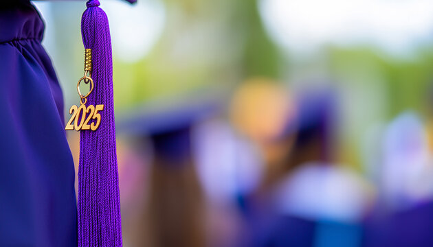 Close-up of a graduation cap with a deep purple tassel featuring a gold "2025" charm, symbolizing future achievements and new beginnings