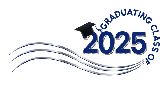 White background - Graduating Class of 2025 in blue and silver text in circle. 2025 is in royal blue text. Graduation cap with blue tassel on top of the year. Wavy silver and blue lines accent.