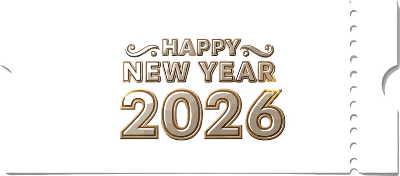 Happy new year 2026 ticket with golden text on white card