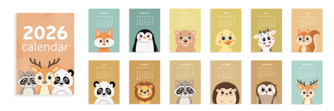Calendar 2026 A4 with Cute Animal Head. Calendar for Children. Week start from Sunday. Vector Illustration. Calendar with Animal Heads.