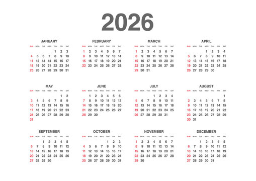 Monthly calendar layout for 2026 year. Diary planner for 2026 year. Week Starts on Sunday.