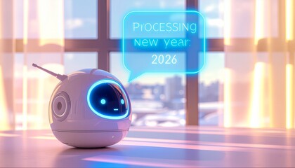Futuristic robot anticipating New Year 2026 in bright, modern office, showcasing technology and innovation for future trends, automation, and digital transformation