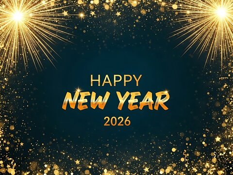 Golden 2026 Happy New Year graphic with dazzling fireworks and glitter, celebrating a fresh start and festive annual countdown