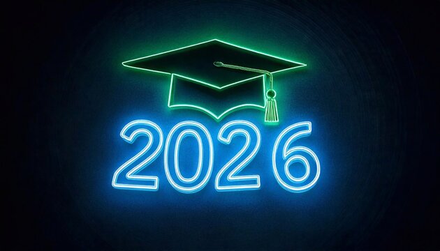 Futuristic graduation class of 2026 banner concept with glowing low polygonal golden graduation cap.