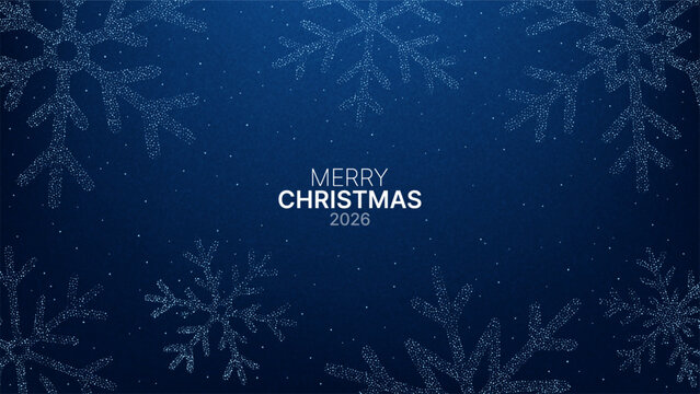Merry Christmas and Happy New Year 2026 greeting card with gold twinkling ornaments against a dark blue background with starry texture.