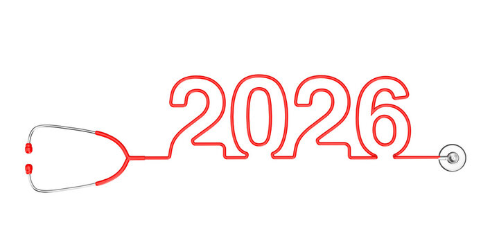 Red Stethoscope Tubing Forming New 2026 Year Sign. 3d Rendering