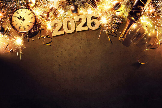 New Year 2026 holiday background with clock, christmas balls, champagne bottle, gift box and lights