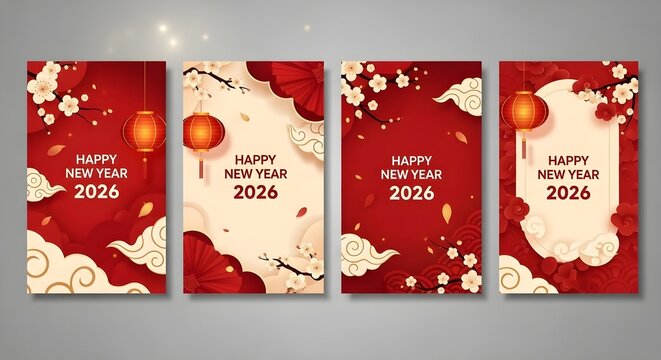 Set of Chinese New Year 2026 greeting cards with horse illustration, lanterns, floral and geometric decorative elements. Graphic vector templates for holiday invitation, postcard, and banner design