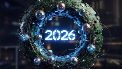 Christmas wreath made of circuits and ornaments with embedded glowing “2026”, sci-fi style.