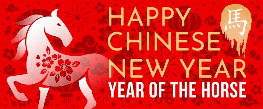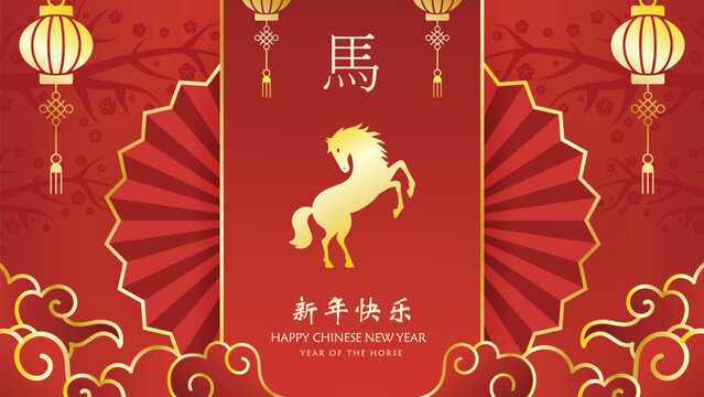 Happy chinese new year 2026 year of the horse vector illustration background. Gold horse zodiac, lanterns, and pattern cloud on red background.