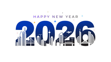 Vector illustration of 2026 happy new year typo with modern high rise building design and city skyline background.