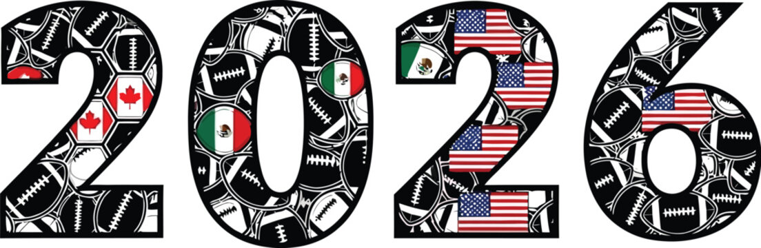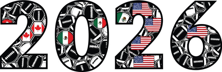 2026 Typography with American Football Pattern and Co-Host Flags of USA, Canada, and Mexico - Vector Illustration