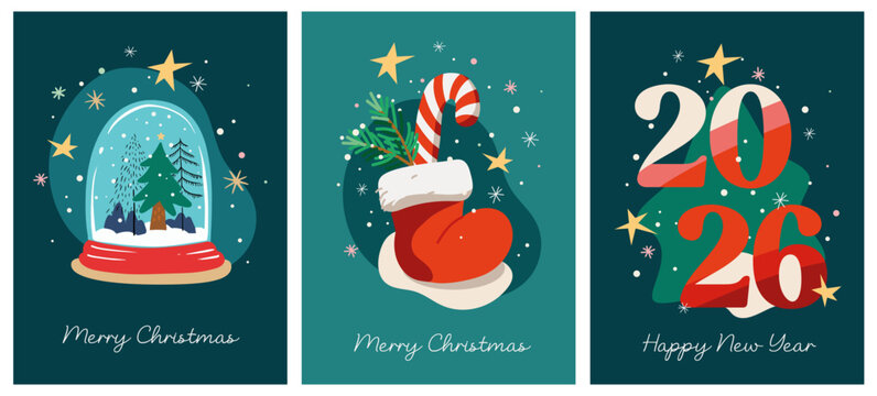 Set of Merry Christmas and Happy New Year 2026 greeting card for invitation, banner, flyer, advertising.