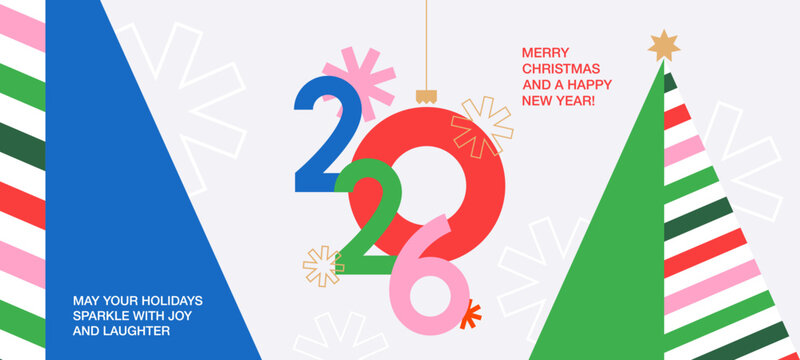 Merry Christmas and Happy New Year greeting card, poster, holiday cover, background template in modern geometric style with number 2026 design, snowflakes, Christmas tree for web, social media, print
