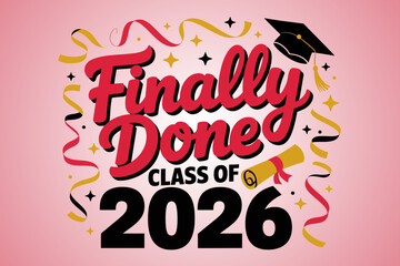 Finally done class of 2026, pink confetti, graduation cap, senior shirt, graduation celebration, modern vector, festive design