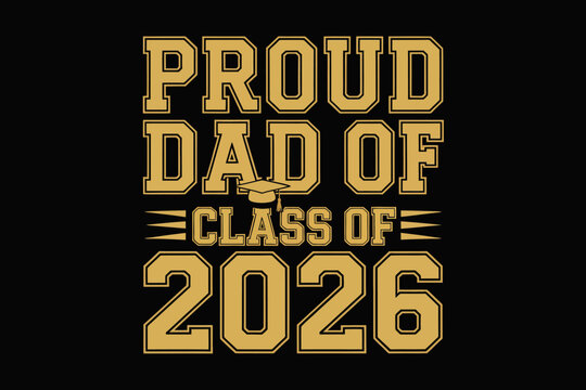Proud dad of class of 2026, bold gold text, graduation cap, senior parent shirt, graduation celebration, modern vector design
