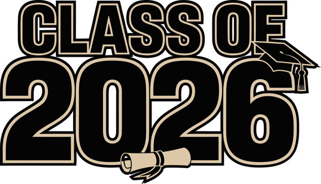 Class of 2026 large black text, graduation cap, senior shirt, graduation celebration, modern vector, school pride illustration