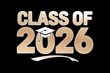 Class of 2026, bold gold text, graduation cap, senior shirt, graduation celebration, modern vector, school pride design