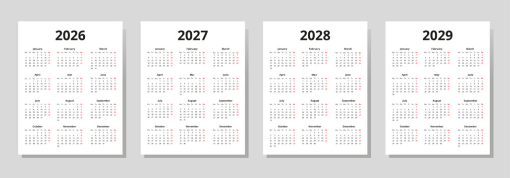 2026, 2027, 2028, 2029 years calendar template set. week starts monday, simple design with red sundays, editable vector