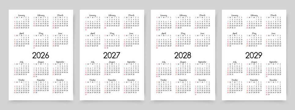 English 2026, 2027, 2028, 2029 calendar start from Sunday. Vector illustration design template for USA, Canada.