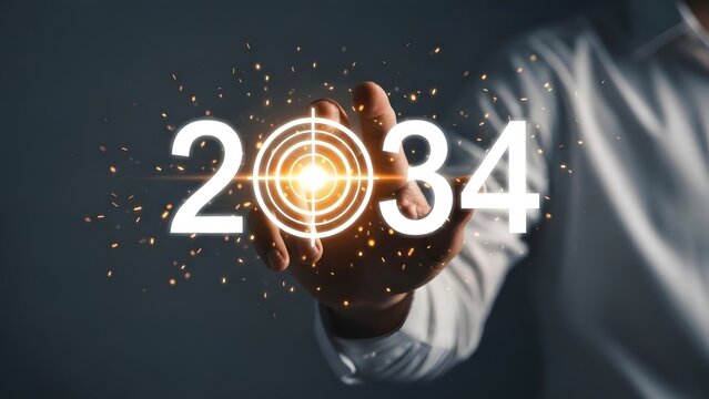 A human hand holding a glowing 2034 symbol with futuristic elements.