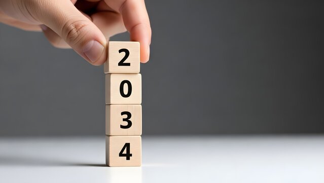 hand places wooden block, completing the year 2034 stacked vertically.