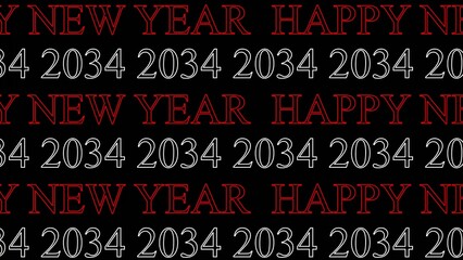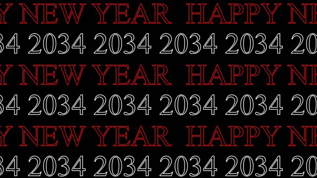 Happy New Year 2034 text pattern with red and Generate title without using the word "Title:" before it. white outlined typography on black background
