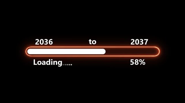 Neon loading bar transitioning from year 2036 to 2037 on black background progress bar progress