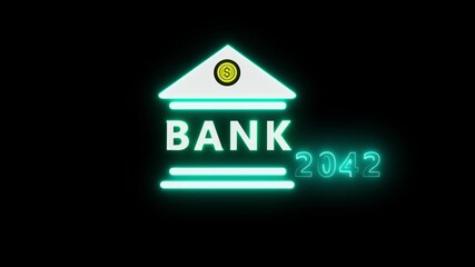 Neon light effect animation of a bank and the year 2042 ,Business representing real estate growth and market innovation bank icon, House loan ,risk management, Insurance and economic recession .
