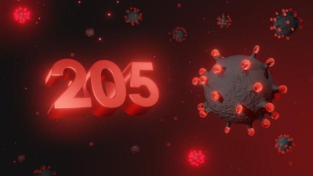 Number 205 in red 3d text on dark corona virus background, 3d render, illustration, virus