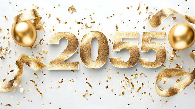 Sparkling golden 2055 new year celebration with confetti and elegant decorations