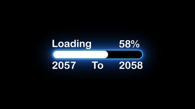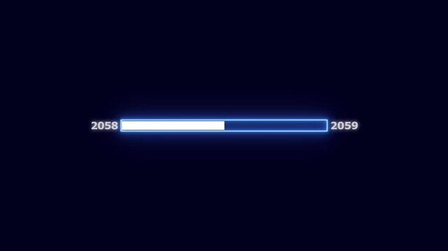 Glowing neon blue loading bar and progress bar from year 2057 to 2058 at percent concept. Loading bar indicates from year 2057 to 2058 new year concept. 4k