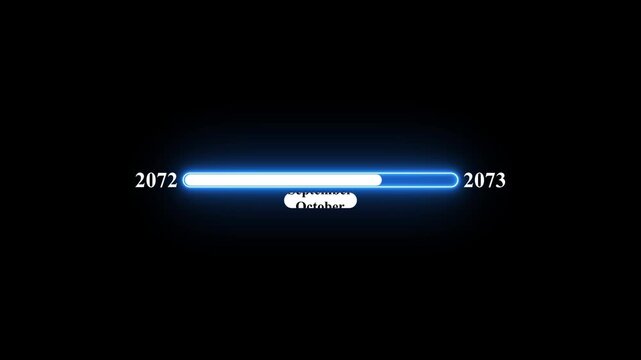 2072 to 2073 loading animation with January 2072 to January 2073 time line on black background, year progress transition, calendar time loading bar, new year change concept