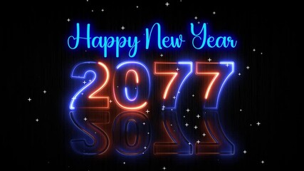 New year 2077 neon text animation. New year count number on black background.  Concept of new year beginning, happy celebration. Neon upcoming new year animated.