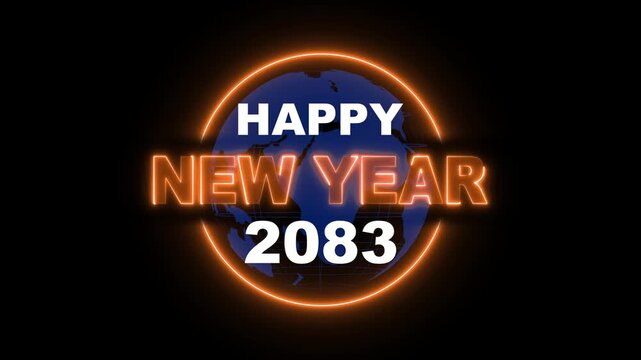 2083 Happy new year 2083 neon animated on rotating globe icon. Glowing Neon Light Happy New Year 2083 Text Reveal. Alpha Channel