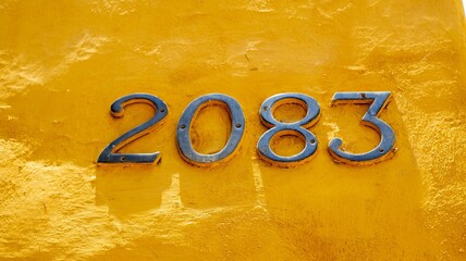 Close-up shot of a metallic number 2083 on amber yellow wall background.