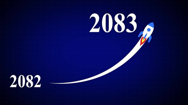 Animated numbers transitioning from 2082 to 2083 with a flying rocket on transparent background. Symbolizes future progress, new year startup goals,