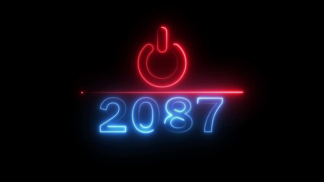 Neon power button icon animation. Start 2087 power button symbol. Switch power button animation. New year beginning, happy celebration.