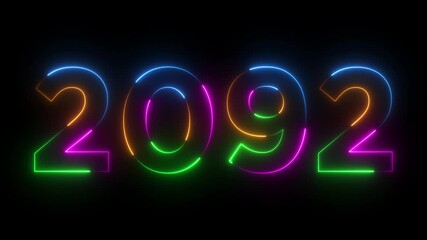 Glowing neon 2092 happy new year 2092 animated text new year on black background. Abstract 2092 neon text animation,