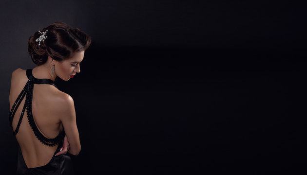 1920s style Happy cheerful flapper woman dancing at party, short mini black fringe dress flying waving in motion. Smiling face girl holding cigarette mouthpiece. golden classic luxury interior room