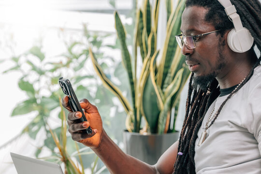 Contented African American Man Listening To Music Wearing Earphones Sitting Holding Hands Behind Head On Sofa At Home. Millennial Guy Relaxing With Eyes Closed Enjoying Playlist. Side View