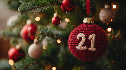 A crocheted advent calendar with the number 21 written on it hangs on a decorated Christmas tree