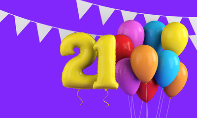 Happy 21st birthday colorful party balloons and bunting. 3D Render